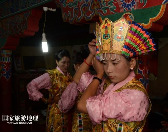 8月3日,在西藏堆龍德慶縣乃瓊鎮(zhèn),覺木隆藏戲團團長瓊達(中)和演員們準(zhǔn)備參加鄰近幾個村的望果節(jié)演出。