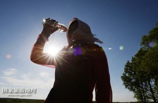 顧蕓香在植樹(shù)間歇喝水(7月23日攝)。