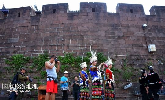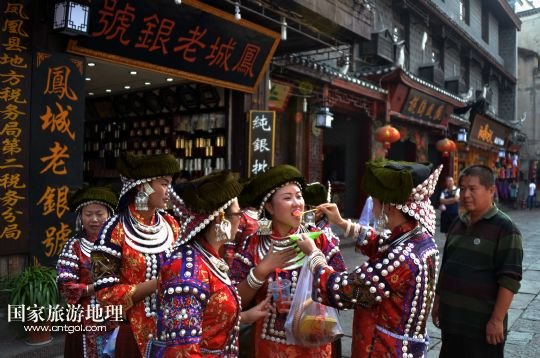 國(guó)家旅游地理 湖南湘西10月14日訊 10月13日,來(lái)自貴州的苗族群眾在鳳凰古城游覽。10月13日,湖南鳳凰古城舉辦第四屆苗族銀飾服飾文化節(jié),來(lái)自全國(guó)各地苗族聚居區(qū)的17支苗族隊(duì)伍盛裝出席,展示傳統(tǒng)苗族民俗文化,并在鳳凰古城內(nèi)幾個(gè)主要景區(qū)進(jìn)行苗服盛裝巡游。 /新華社記者趙眾志攝