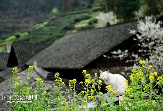 慶陽古街花香四溢,一只大白貓在樓頂獨享風景(3月27日攝)。