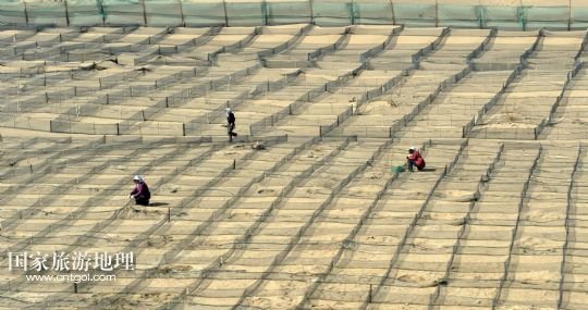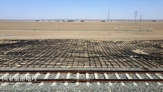 國家旅游地理 內(nèi)蒙古阿拉善4月21日訊 錯落布局在內(nèi)蒙古臨策鐵路(臨河——策克)旁的網(wǎng)格沙障(4月18日攝)。穿越我國北疆內(nèi)蒙古阿拉善高原大漠的呼和浩特鐵路局臨策鐵路沿線有400多公里“無人區(qū)”,這里常年干旱少雨、風(fēng)沙肆虐、植被稀少、人跡罕至,30多萬平方公里的荒漠、戈壁縱橫交錯,自然條件極度惡劣。
