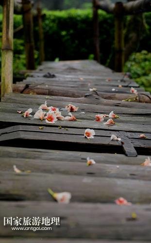 雨后,居民通行的木橋上桐花灑落(4月27日攝)。