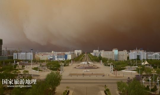 國家旅游地理 甘肅玉門5月23日訊 5月23日,在甘肅玉門市,突如其來的沙塵籠罩了整個城市。當日上午,受新疆低槽冷空氣的影響,甘肅玉門境內天空出現罕見的云層奇景和沙塵天氣,原本非常晴朗的藍天,霎時天昏地暗,同時伴有6至7級西風,能見度只有500米。新華社發(fā)(楊旭升 宋常青 攝)