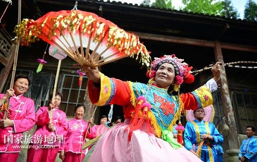 國(guó)家旅游地理 湖北恩施5月28日訊 5月27日,湖北省利川市柏楊壩鎮(zhèn)柏壩楊村的民間藝人陳文菊在表演利川燈歌的代表作《龍船調(diào)》。利川燈歌起源于湖北省恩施土家族苗族自治州利川市柏楊壩鎮(zhèn)一帶,距今約300多年歷史,2011年入選第三批國(guó)家級(jí)非物質(zhì)文化遺產(chǎn)名錄。有記載稱,從清朝開始,當(dāng)?shù)厝罕姺昴赀^節(jié)、喜慶集會(huì)、玩彩龍船時(shí)都要唱燈歌。如今,在柏楊壩鎮(zhèn),有一些熱愛民族文化的老藝人,用心口相傳的形式傳唱利川燈歌,釋放土家人豁達(dá)、幽默的人生情懷。利川燈歌具有很高的民族文化藝術(shù)價(jià)值,《龍船調(diào)》《篩子關(guān)門眼睛多》《打把扇子送情》等一批燈歌旋律優(yōu)美、歌詞詼諧生動(dòng),深受人們喜愛。新華社發(fā)(楊順丕 攝)