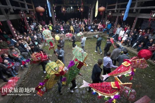 國家旅游地理 浙江麗水11月10日訊 11月8日,浙江景寧畬族自治縣九龍鄉(xiāng)嶺里村的村民在徐氏宗祠內(nèi)表演傳統(tǒng)非遺節(jié)目——魚燈。當(dāng)日,浙江省麗水市景寧畬族自治縣“中國畬鄉(xiāng)魚燈藝術(shù)村展示非遺之美·慶祝豐年活動(dòng)”在九龍鄉(xiāng)嶺里村舉行。嶺里村自古有在節(jié)日里舞魚燈的習(xí)俗,寄托著人們期望生活吉祥如意、連年有余的美好愿望。 新華社發(fā)(李肅人 攝)
