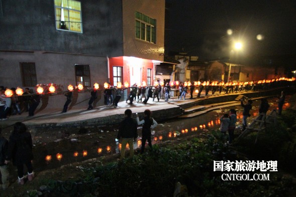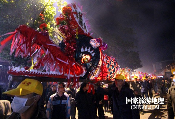 2月18日入夜,春雨霏霏。在光裕堂祖祠祭龍頭畢,鄒姓村民紛紛肩抬慶燈到祖祠接成220多米長(zhǎng)的“龍”身。三聲銃響,游龍時(shí)而在村間慢悠游弋,時(shí)而在村道滯拔狂走,火紅的燭光伴著霏霏春雨,讓?xiě)c燈“龍”絢麗多姿,展示了“紙包火”的奇跡。 游“龍”所經(jīng)之處,鞭炮和禮花聲不絕于耳,祈求五谷豐登、吉祥如意。街巷人山人海,熱鬧非凡,一派花燈游龍慶豐收狂歡鬧元宵盛況。 吸引了海內(nèi)外游客及四鄰八鄉(xiāng)的萬(wàn)余群眾紛紛前往觀看。