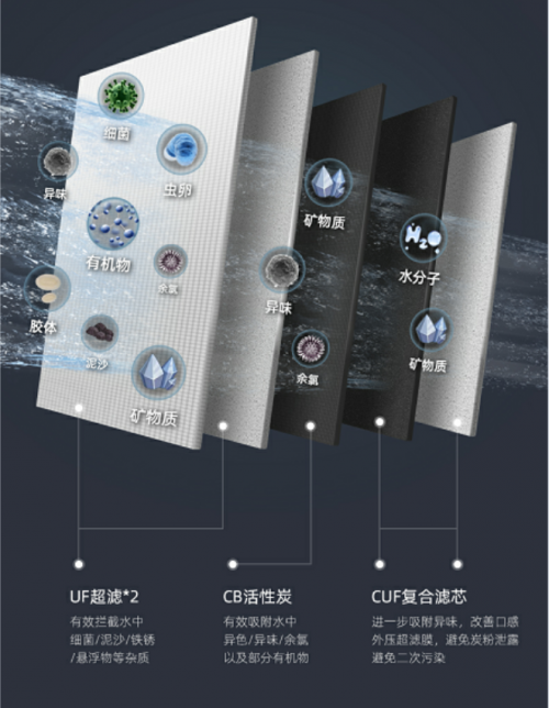 除去主濾芯,另外兩個(gè)副濾芯分別是CB活性炭濾芯和CUF活性炭超濾膜復(fù)合濾芯。其中,CB活性炭濾芯吸附水中余氯、異色異味、有機(jī)物,改善飲水口感,讓自來水變得更加甘甜鮮活,口感甚佳;而CUF活性炭超濾膜復(fù)合濾芯則能進(jìn)一步吸附水中的余氯等異色異味,提升飲水口感,并防止碳粉泄露和微生物侵入,避免水質(zhì)二次污染。